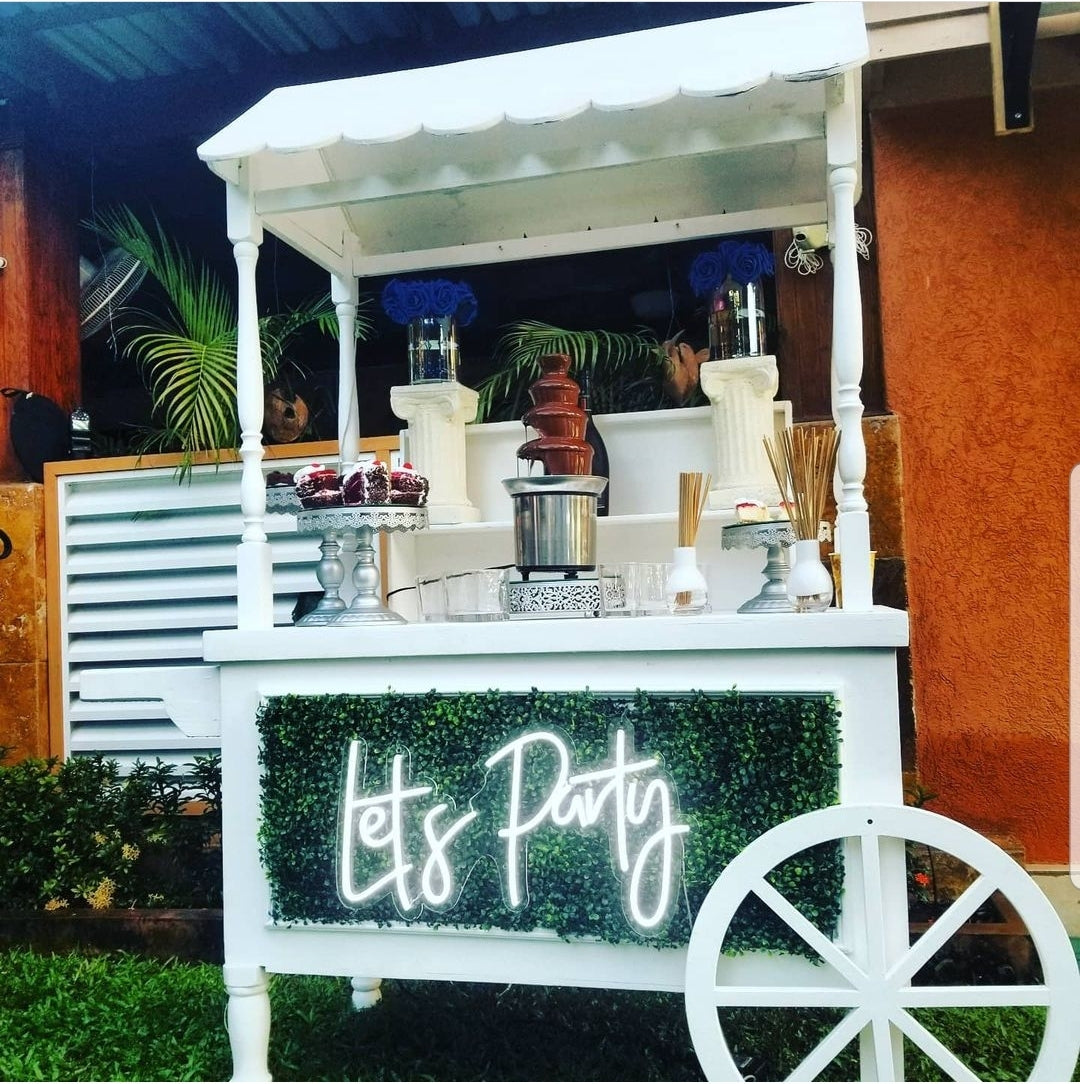 - This charming white rental cart features a scalloped canopy top, decorative side detail, and a large front wheel design. Perfect for weddings, parties, and events as a display cart for treats, favors, or décor.